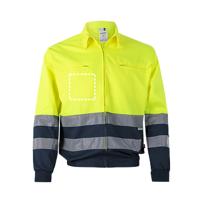 Zweifarbige Twilljacke (210 g/m²) aus Polyester (80%) und Baumwolle (20%). Zentraler Reissverschluss, elastischer Seitenbund und Rippbündchen. Reflektierende Streifen auf dem Rumpf und den Ärmeln sowie zwei Reissverschlusstaschen auf dem Rumpf. Produkt gemäss EU-Verordnung 2016/425, zertifiziert nach EN20471 und Klasse Nº 2. Grösse: 4XL, 5XL