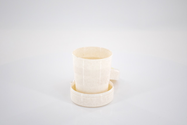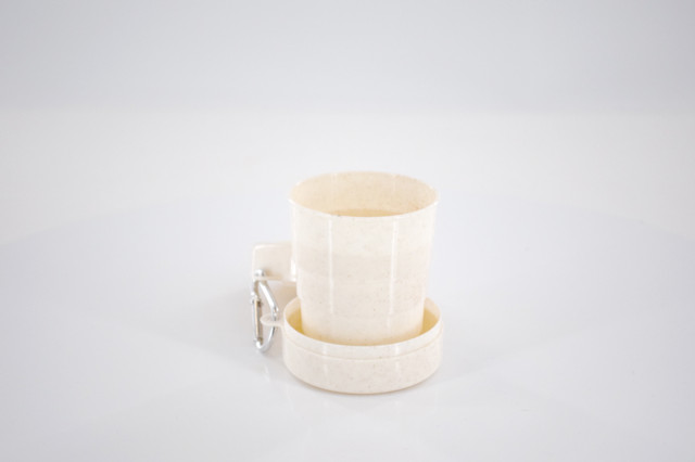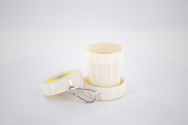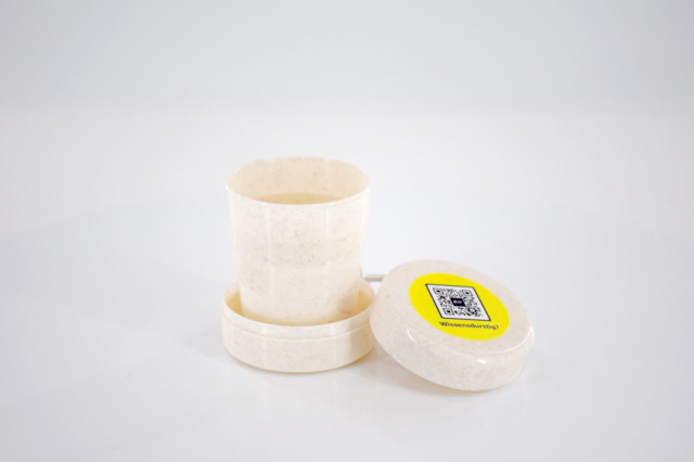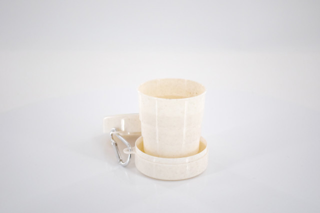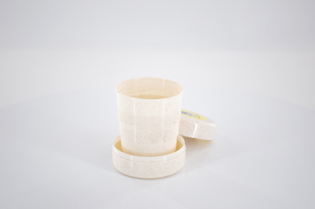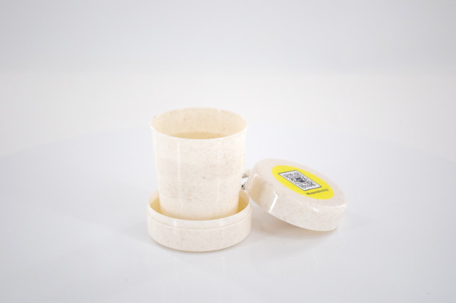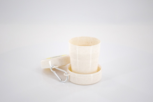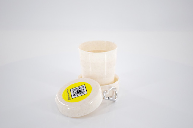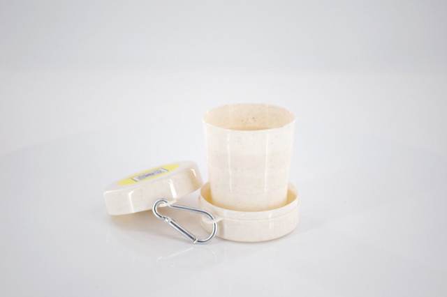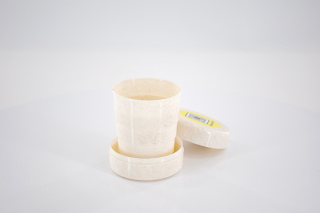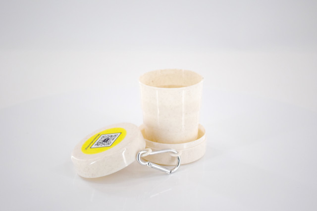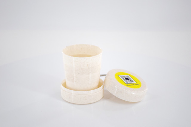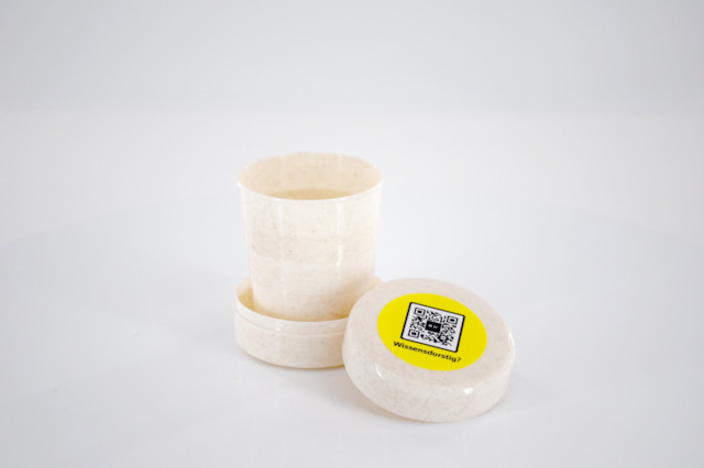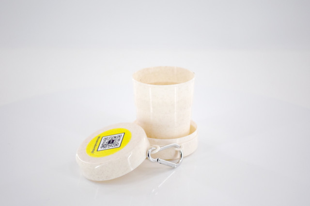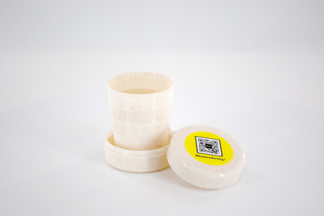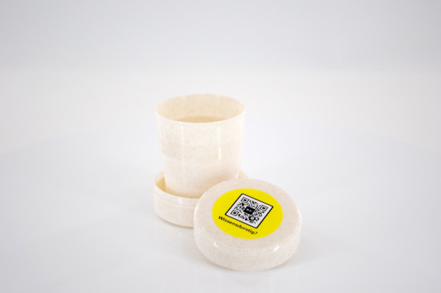 Faltbecher aus Stroh. Bedruckt in der Schweiz